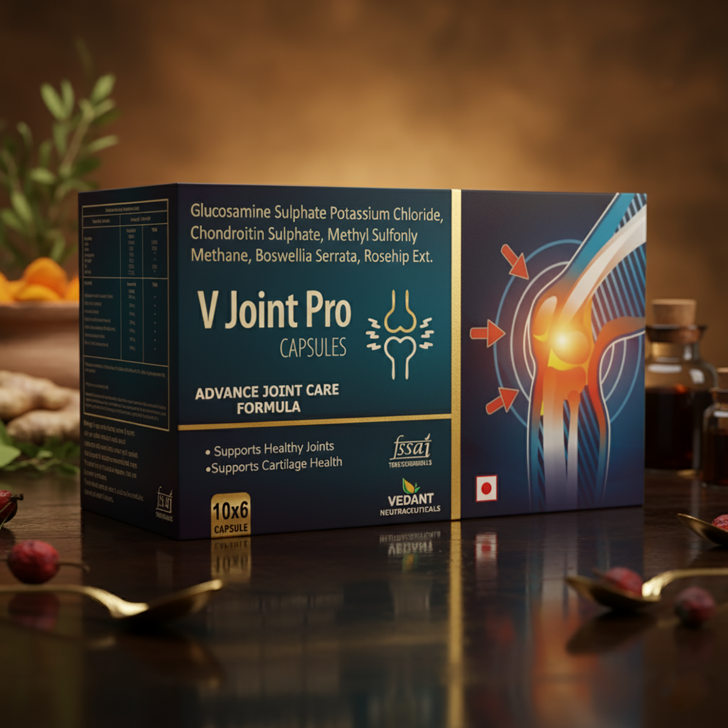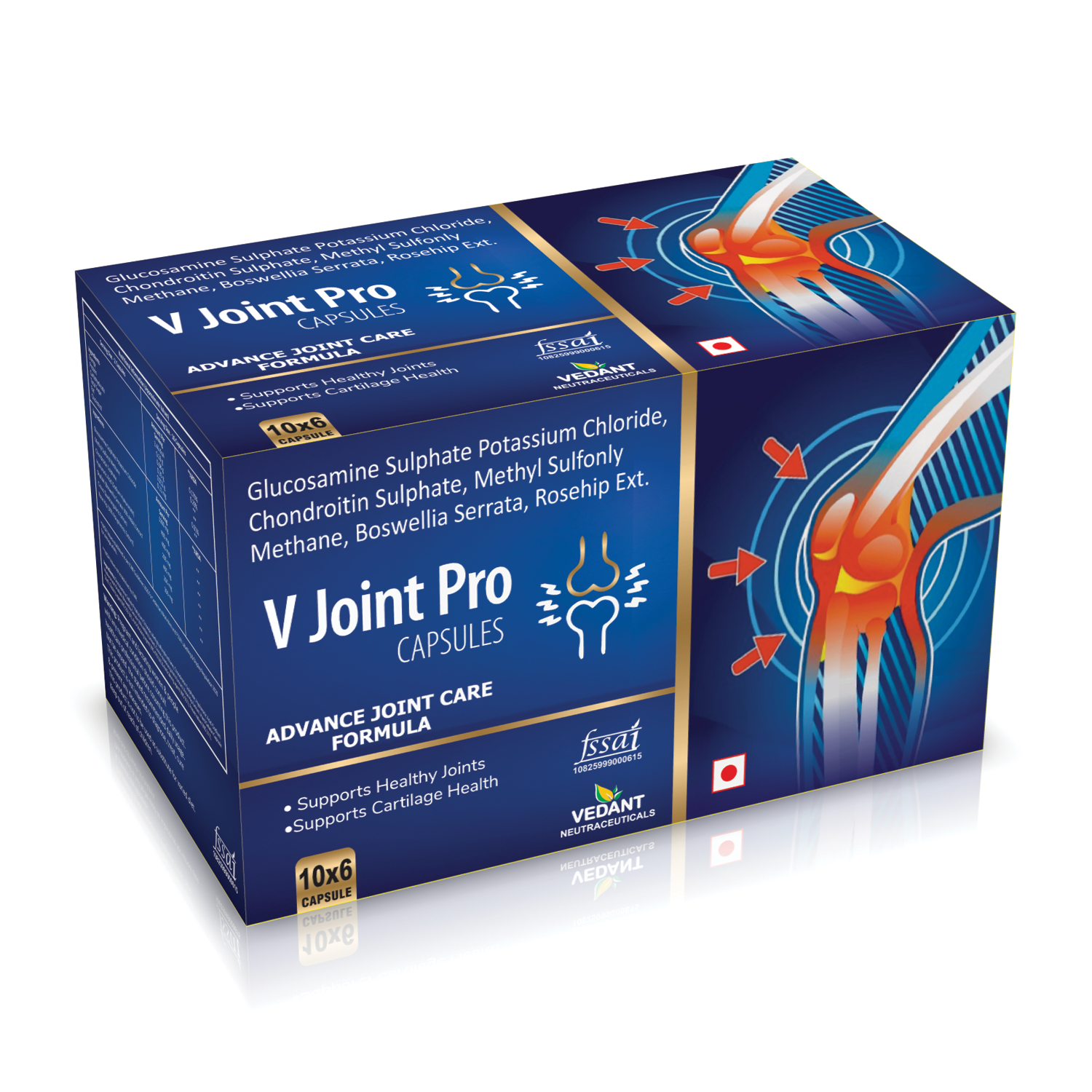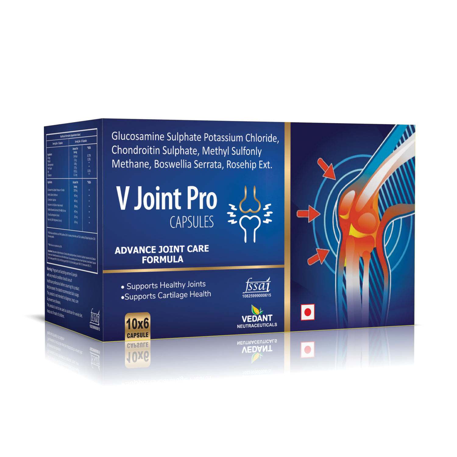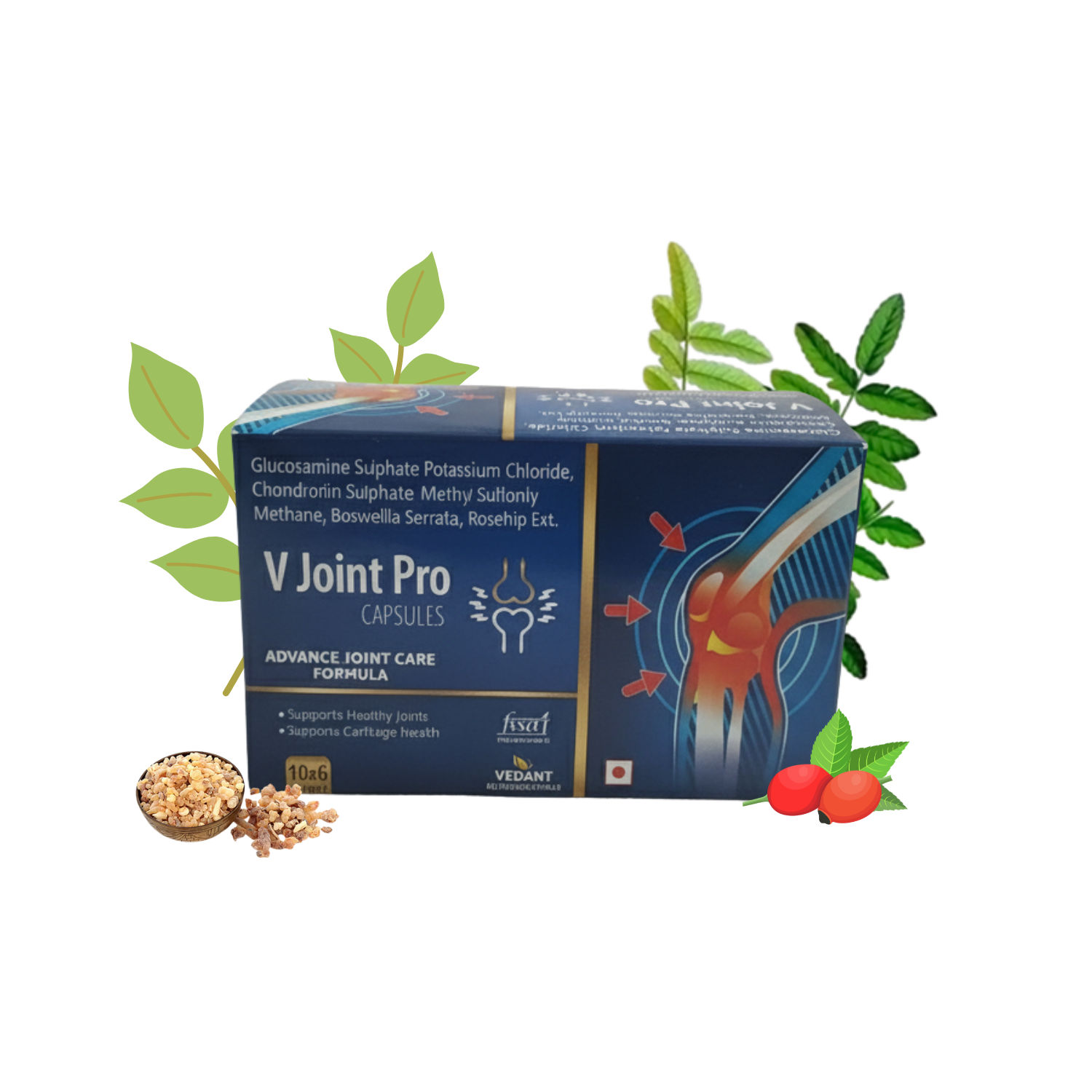 V Joint Pro Capsules is an advanced joint care supplement scientifically formulated to promote joint flexibility, comfort, and mobility. Enriched with a synergistic blend of Glucosamine Sulphate Potassium Chloride, Chondroitin Sulphate, MSM (Methyl Sulfonyl Methane), Boswellia Serrata, and Rosehip Extract, it supports cartilage health and helps reduce stiffness caused by aging, injury, or daily wear and tear.